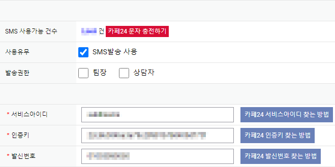 환경설정->SMS설정에서 카페24 문자연동 설정을 해야합니다.