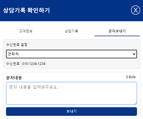 클릭 후 문자 보내기 창에서 아래와 같이 문자를 전송할 수 있습니다.