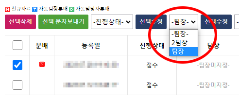 고객현황에서 팀장 또는 담당자를 분배할 대상을 선택합니다.